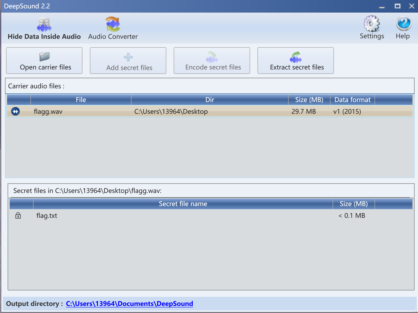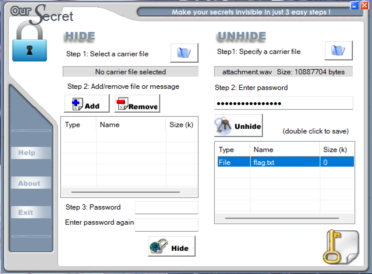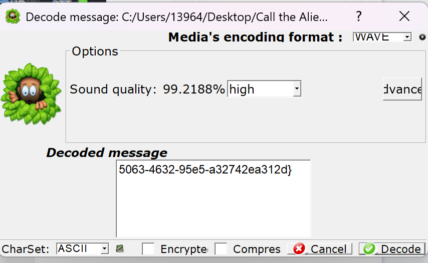 Decode.exe -X -P 12345 flag.mp3