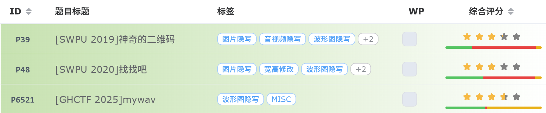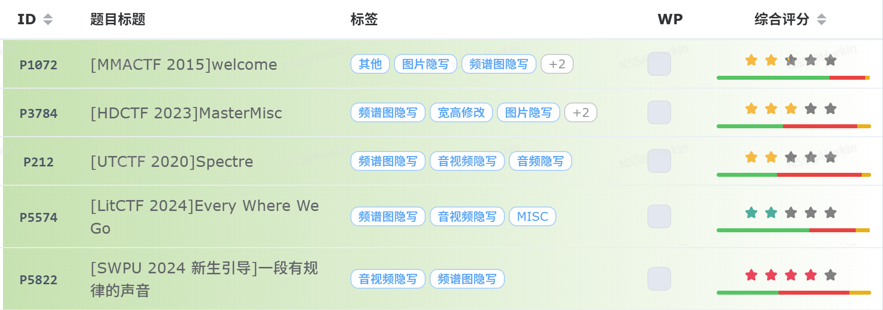 | Deepsound | 听上去很正常 但是文件体积比预期大很多 比如说30秒的语言有20MB 用binwalk或者foremost扫描可能发现隐藏的文件结构 |