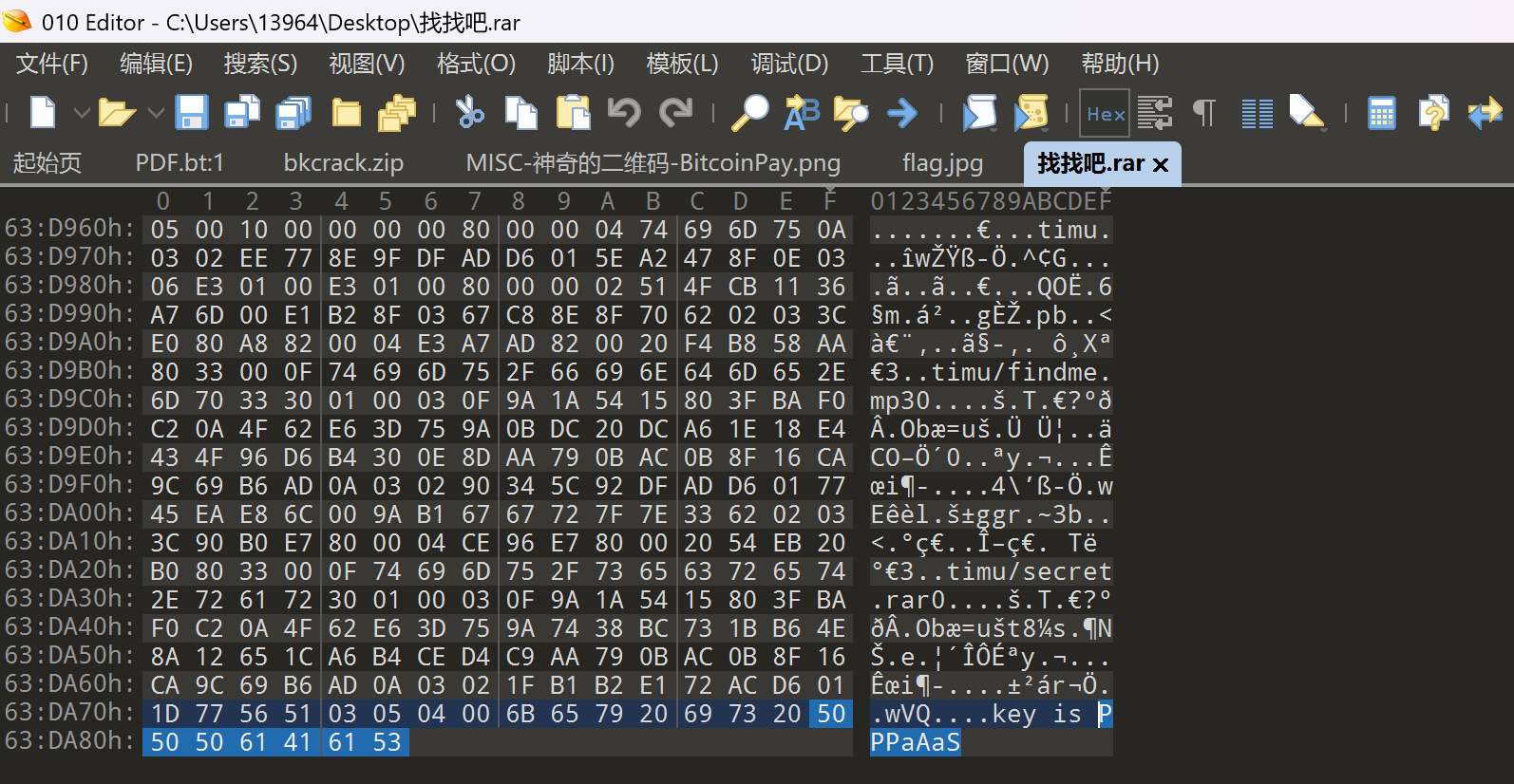 010打开找找吧.rar末尾获得findme.mp3的密码PPPaAaS